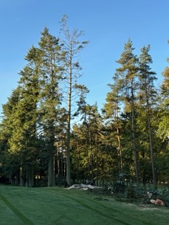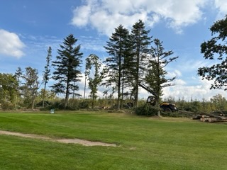 fældet en hel del af de meget store graner ved toiletbygningen mellem hul 13/17. Bag drivning rangen er