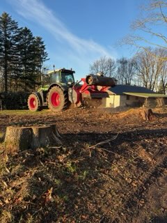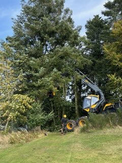Skovbygård A/S om træfældning med opstart i uge 40. De har fældet gamle store grantræer mange steder